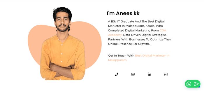 I Am Anees KK, The Number One Digital Marketer In Malappuram, Kerala. My Skills And Knowledge Encompass Social Media Marketing, SEO, And Web Development. I Have Extensive Experience And A Proven Track Record In Delivering Top-notch Digital Marketing Services To Clients In The Region.
