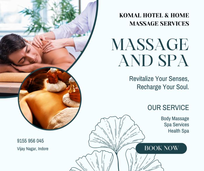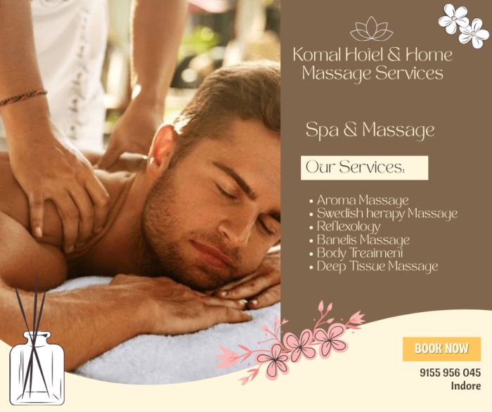 "Affordable Full Body Massage In Vijay Nagar, Indore Discover Relaxation At Komal Hotel & Home Massage Services With A Special Discount On Our Massage Services. Known For Delighting Spa Enthusiasts, We’re A Trusted Choice For Wellness In Vijay Nagar, Indore. Our Skilled Therapists Specialise In Therapies Such As Swedish Massage, Deep Tissue Massage, Thai Massage, And Aroma Massage. Komal Hotel & Home Massage Services Is Celebrated For Providing A Soothing Ambiance And Professional Services Tailored To Your Needs. Visit Komal Hotel & Home Massage Services In Vijay Nagar, Indore For A Relaxing And Rejuvenating Experience."
